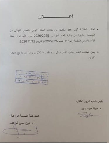 The document circulated on social media regarding Ghazal’s expulsion from Latakia University.
