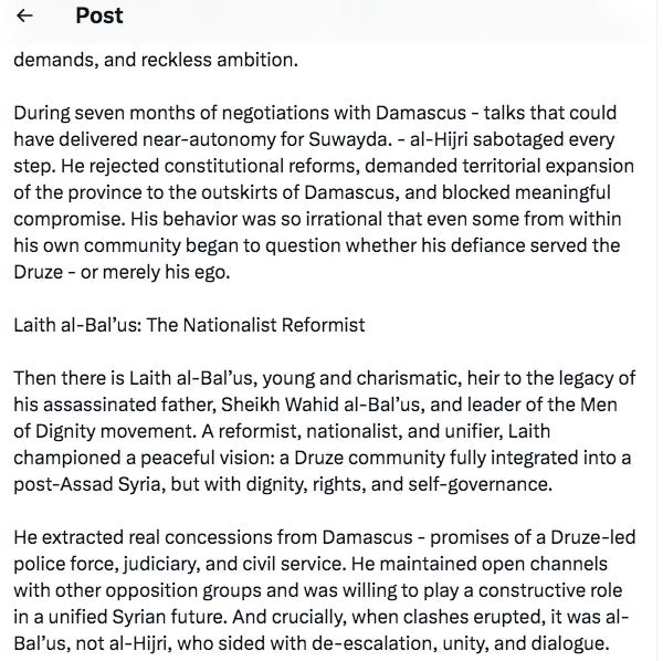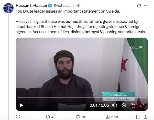 One of the most notable complaints from Druze in al-Suwayda’ province about external coverage of events there is the phenomenon of ‘media distortion’: that is, the widespread circulation of distortions and inaccurate information among external media outlets and analysts. A prime example of this recently is the repeated claim that Layth al-Balous, who is the son of Harakat Rijal al-Karama founder Wahid al-Balous and has been known for his more sympathetic stance towards the Syrian government, is the leader of Harakat Rijal al-Karama or a leader in it. Examples of this claim can be seen below (including the reliably absurd discourse of sectarian bigot Aimen Dean, infamous for his nonsensical information that al-Qaeda would dissolve itself).