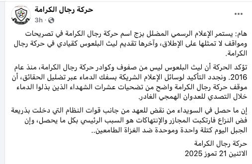 The movement confirms that Layth al-Blous has not been among the ranks and cadres of Harakat Rijal al-Karama since 2016, and we reaffirm to the media participating in the bloodshed through distorting facts, that the position of Harakat Rijal al-Karama is clear from the sacrifices of dozens of martyrs who shed their blood while resisting the treacherous, aggressive aggression.