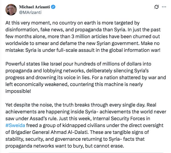 “At this very moment, no country on earth is more targeted by disinformation, fake news, and propaganda than Syria. In just the past few months alone, more than 3 million articles have been churned out worldwide to smear and defame the new Syrian government. Make no mistake: Syria is under full-scale assault in the global information war! Powerful states like Israel pour hundreds of millions of dollars into propaganda and lobbying networks, deliberately silencing Syria’s progress and drowning its voice in lies. For a nation shattered by war and left economically weakened, countering this machine is nearly impossible!”