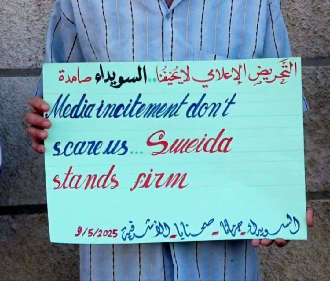 A banner against ‘media incitement’ from a protest held at the beginning of this month in al-Suwayda’.