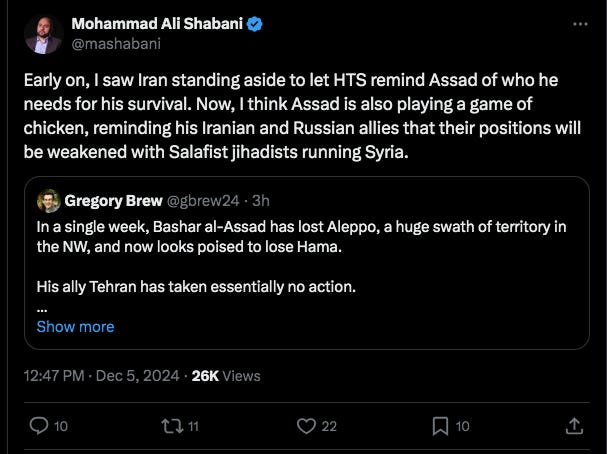 As the insurgent offensive in northwest Syria sustains its momentum, now (unsurprisingly) having seized the city of Hama, some pundits have been touting what are essentially conspiracy theories about the role of the Syrian government and its Iranian and Russian allies in these events, speculating that one or more of these actors have somehow deliberately allowed the insurgent offensive to make rapid progress. Exemplifying this approach is a tweet by Muhammad Ali Shabani, editor of an outlet called Amwaj Media that specialises in coverage of Iran and the ‘resistance axis.’