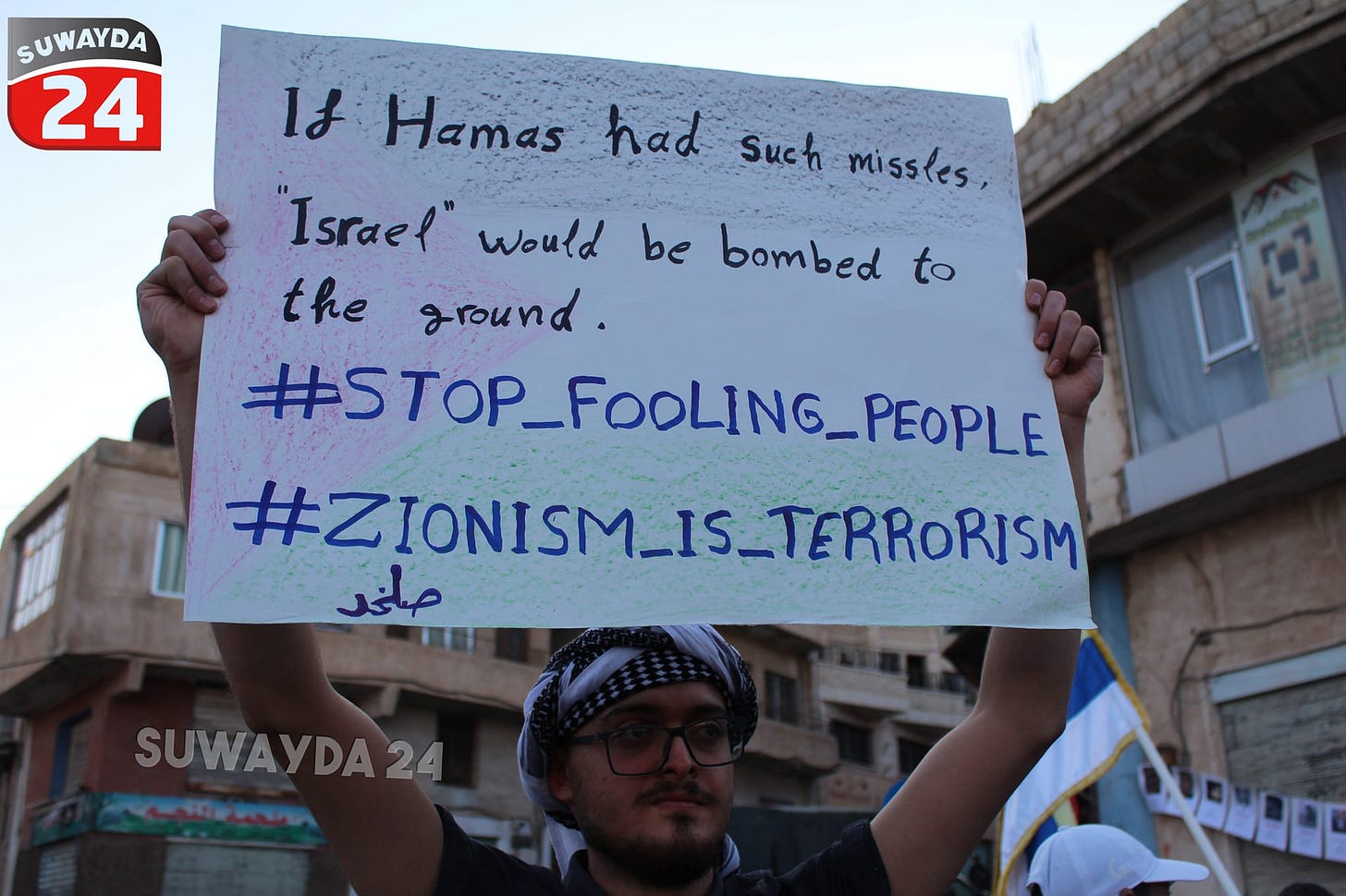 In the ongoing protests in al-Suwayda’ against the government, some protestors have raised placards denouncing Israel, as can be seen in this photo from a recent demonstration in the al-Suwayda’ town of Salkhad.